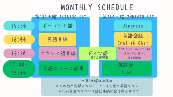 英語の記事を読む会、英語やフランス語の音読会、英語で会話する会、フランス語の記事を読む会、ドイツ語の勉強会など。