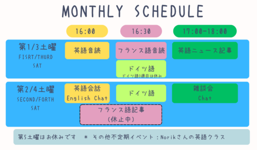 一緒に語学の勉強をしたり、雑談会で日々の話をしたり。初めての方もお久しぶりの方もお待ちしております。